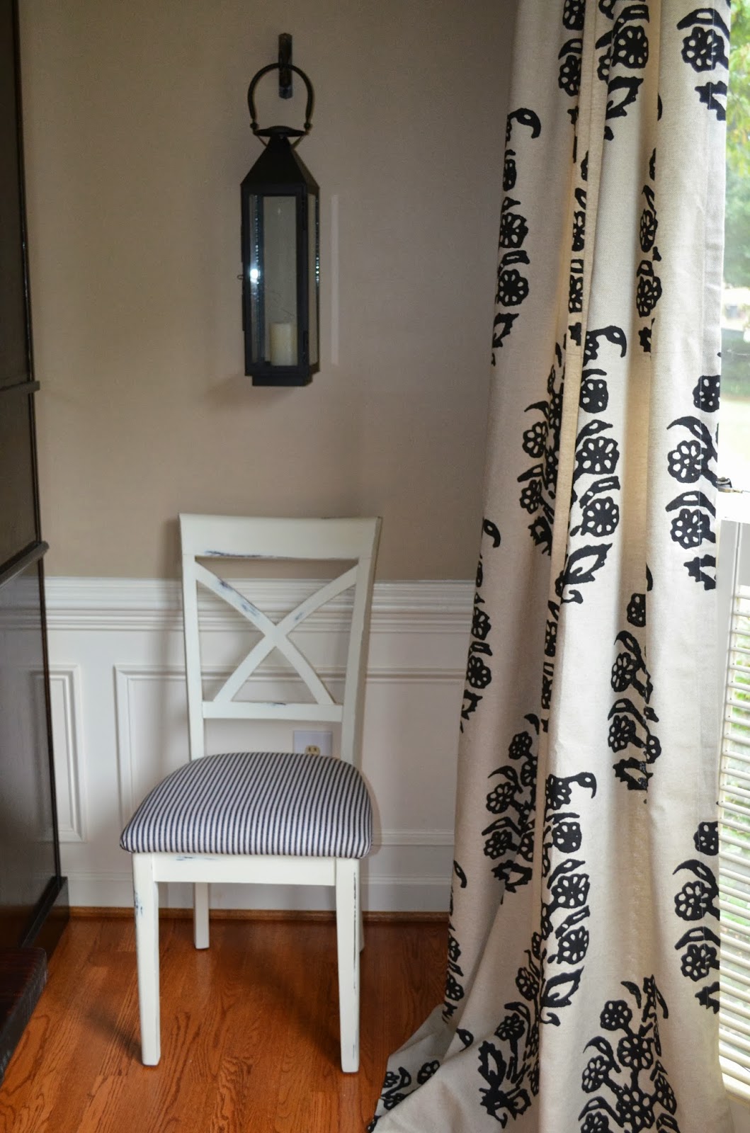 Well, I finally finished up my dining chairs I started nearly a month ago... oops. Ok, I've only finished 2 of them, and have 2 to go, but who is counting (my husband). I don't recommend starting a big project well into your third trimester, ha. Anyways, I am loving the new dining room look. I decided to pull in black and white to make it tie into the rest of the first floor. The curtains I scored at the Ballard outlet (Concorde Medallion Panels) a few months ago for $30 a panel. That's right.